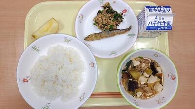牛乳 ご飯 生揚げの肉みそ煮 ししゃものパリパリ揚げ のり和え りんご