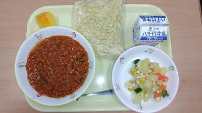 牛乳 スパゲッティ ミートソース(具) マセドアンサラダ 柿