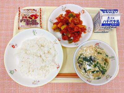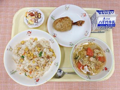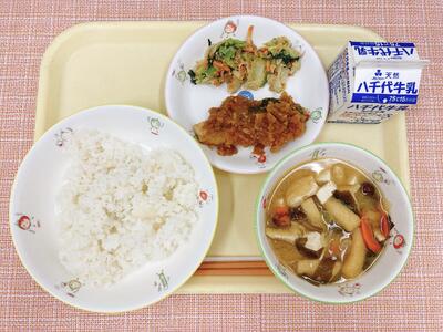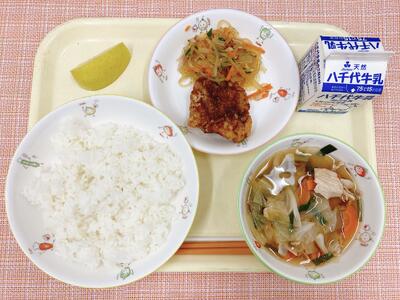 牛乳 ご飯 油淋鶏 バンサンスー 中華スープ りんご