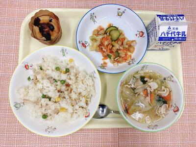 牛乳 ハムピラフ ひよこ豆のサラダ 野菜スープ ブルーベリーマフィン