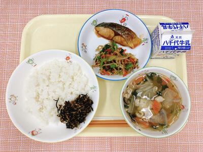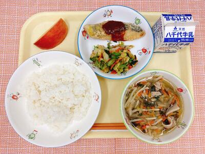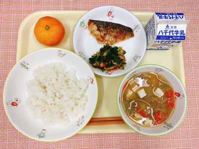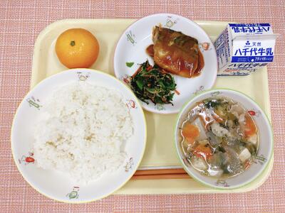 牛乳 ご飯 鯖のバーベキュー焼き 柚子香和え 根菜汁 みかん