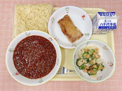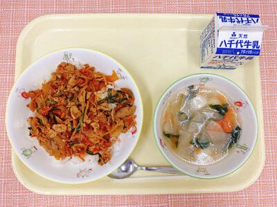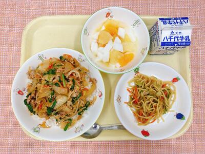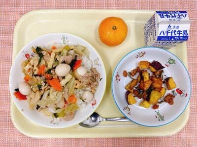 牛乳 麦ご飯 中華丼の具 大豆のカリカリ揚げ みかん