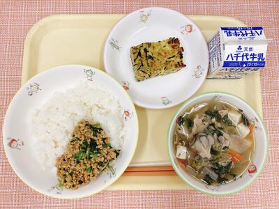 牛乳 ご飯 味付け海苔 ニラ入り玉子焼き おかか和え 生揚げの肉味噌煮