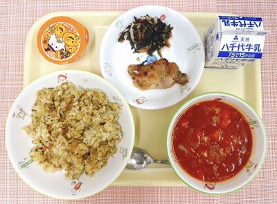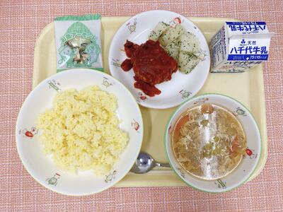 牛乳 ご飯 生揚げの韓国風野菜炒め 中華風コーンスープ りんごゼリー