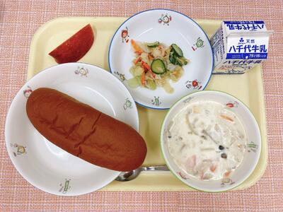 牛乳 黒糖パン クラムチャウダー フレンチサラダ りんご