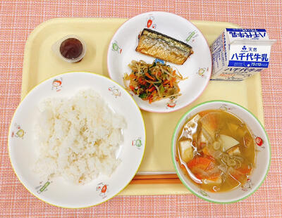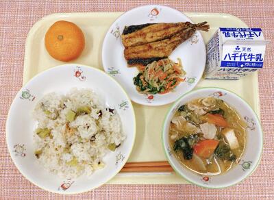 牛乳 ご飯 秋刀魚の塩焼き 柚子香和え 根菜汁 ひとくちぶどうゼリー