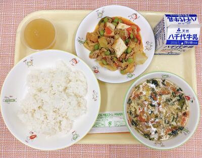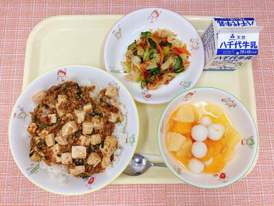 牛乳 麦ご飯 四川マーボー豆腐丼の具 パリパリサラダ フルーツ白玉