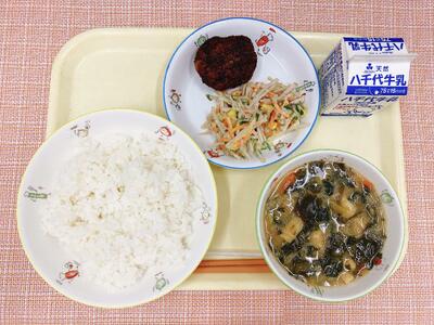 牛乳 ご飯 塩昆布メンチ ごぼうサラダ 青菜と油揚げの味噌汁