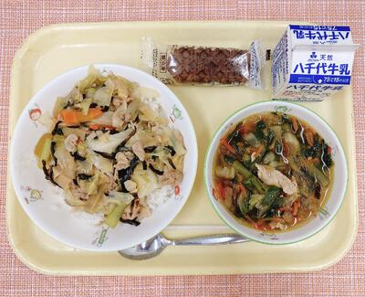 牛乳 麦ご飯 豚と野菜のあんかけ丼の具 春雨スープ 原宿ドック