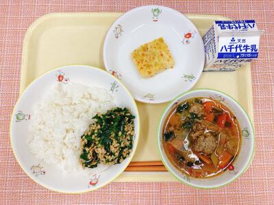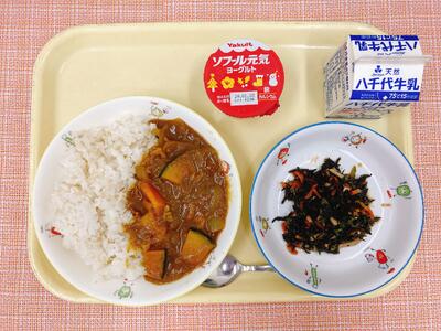 牛乳 麦ご飯 かぼちゃ入りポークカレー ひじきのマリネ ヨーグルト