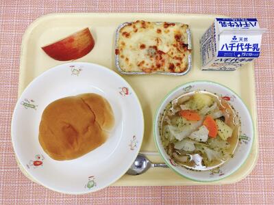 牛乳 バターロール リヨン風ポーチドエッグのグラタン ニンニクスープ りんご