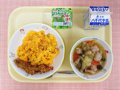 牛乳 ターメリックライス ミートボール 粉ふき芋 卵とキャベツのスープ アーモンドフィッシュ