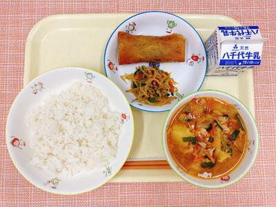 牛乳 ご飯 ひじき春巻き もやしのナムル キムチチゲ