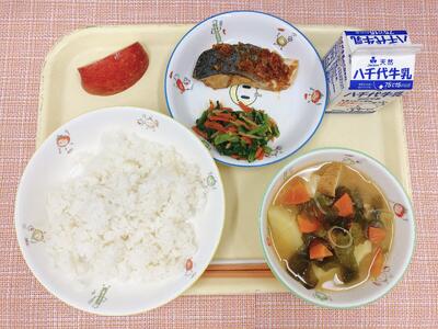 牛乳 ご飯 いなだの香味焼き 辛子和え じゃが芋とわかめの味噌汁 りんご