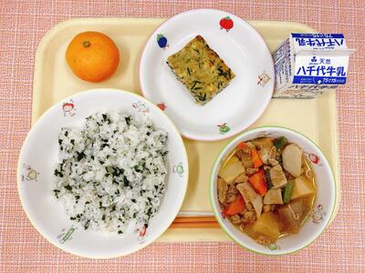 牛乳 しらすわかめご飯 千草焼 大根とばら肉の旨煮 みかん