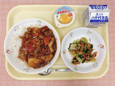 牛乳 麦ご飯 ハヤシライスソース 海藻サラダ 伊予柑ゼリー