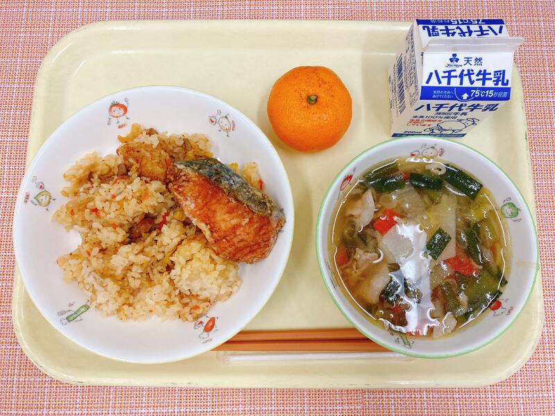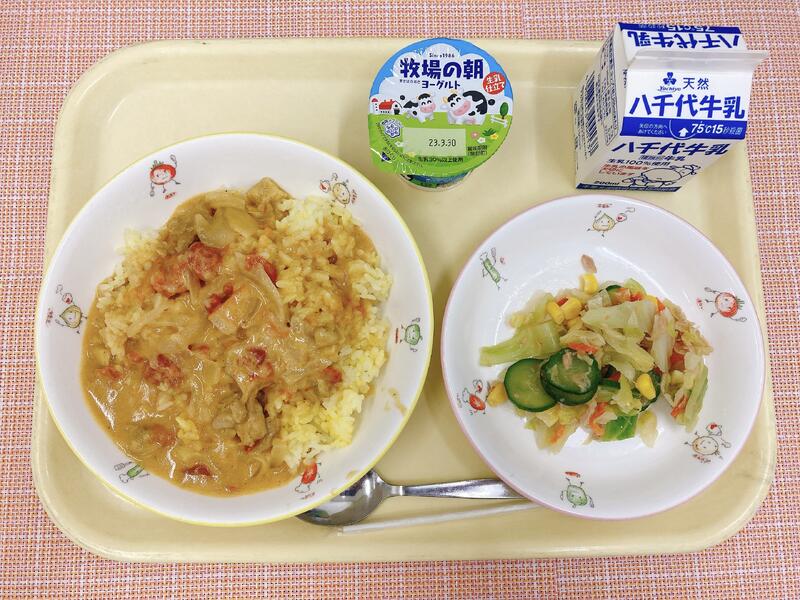 牛乳 コーンピラフ フィッシュサラダ ミネストローネ 小夏