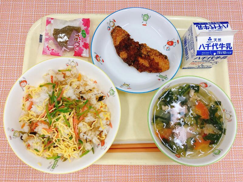 牛乳 五目ちらし 白身魚のフライ すまし汁 桜餅