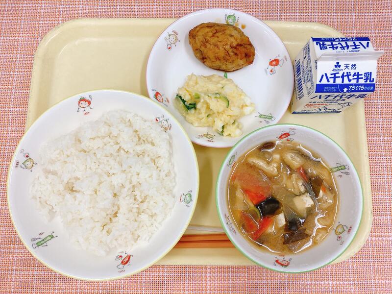 牛乳 ご飯 筍ハンバーグ ひよこ豆のサラダ 具だくさん味噌汁