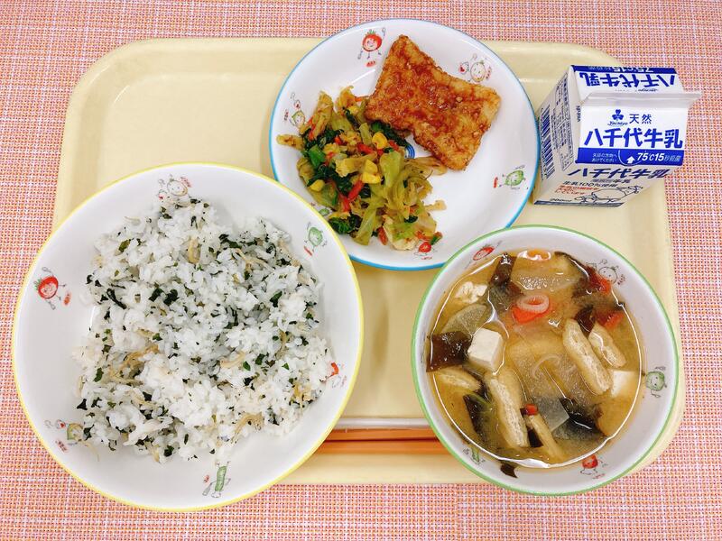 牛乳 じゃこわかめご飯 いかのかりん揚げ おかか和え 豆腐の味噌汁