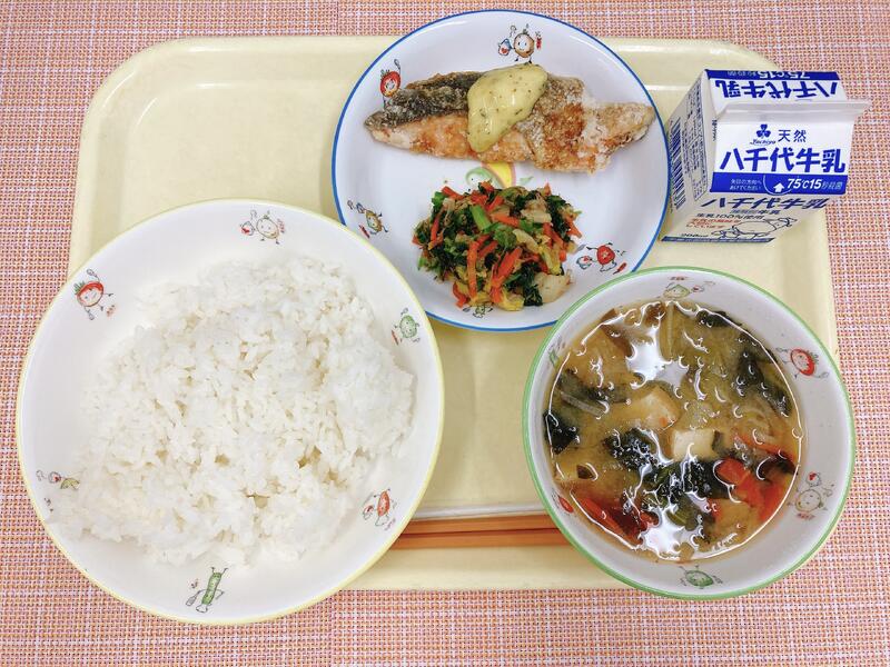 牛乳 ご飯 鮭のタルタル南蛮ソースがけ 三色おひたし 切干大根とわかめの味噌汁