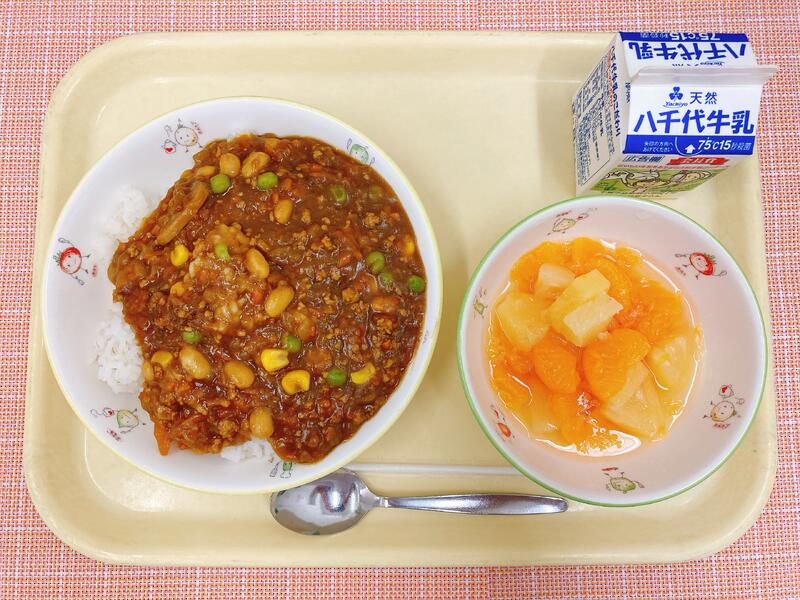 牛乳 麦ご飯 キーマカレー フルーツポンチ
