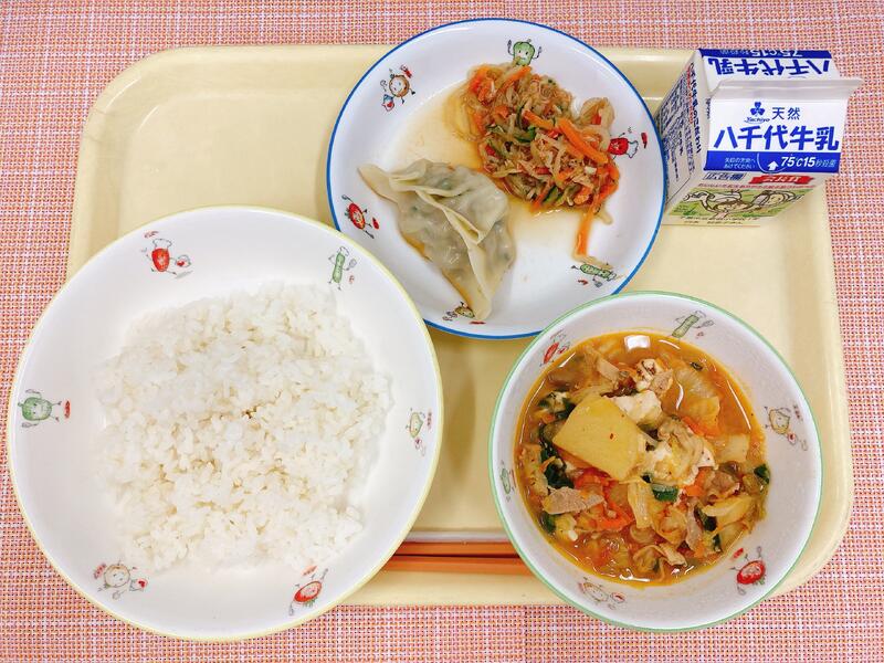 牛乳 ご飯 ジャンボ蒸し餃子 中華サラダ あさりのキムチチゲ