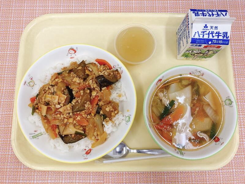 牛乳 麦ご飯 なすのスタミナ丼の具 ワンタンスープ パインゼリー