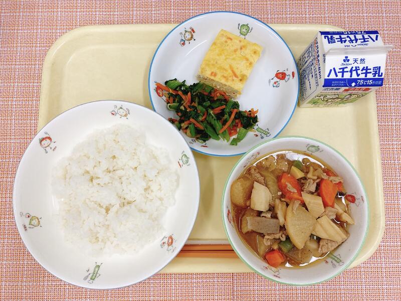 牛乳 ご飯 ぎせい豆腐 辛子和え 大根とばら肉の旨煮