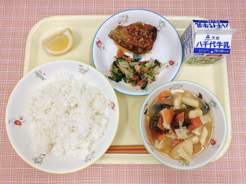 牛乳 ご飯 鰤の照り焼き 菜の花和え 僧兵汁 デコポン
