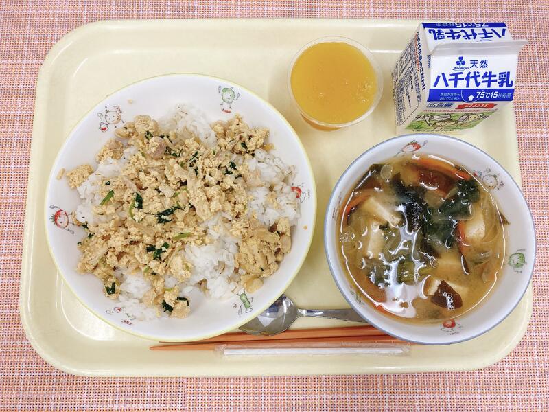牛乳 三色そぼろご飯 しらすサラダ 根菜汁 オレンジゼリー