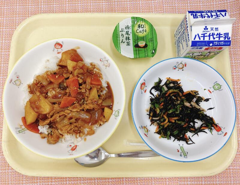 牛乳 ご飯 チキンカレー ひじきのマリネ お祝いゼリー