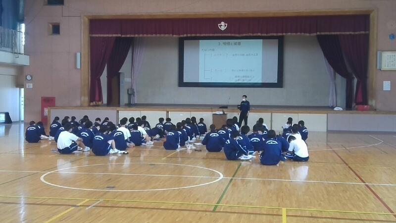 体育館のスクリーンを使って『タバコの害』についての授業をしていました。