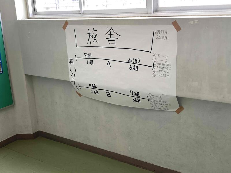 B棟の踊り場には、競技についての動きを示す掲示物が貼られていました。