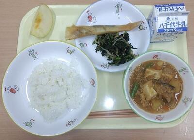牛乳 ご飯 生揚げの肉みそ煮 ししゃものパリパリ揚げ のり和え りんご