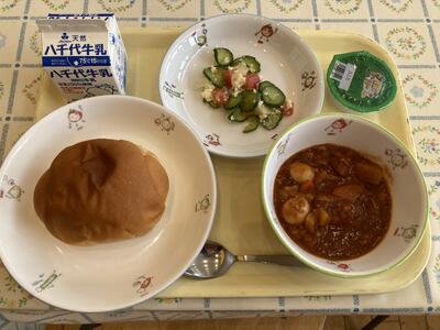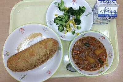 牛乳 きなこ揚げパン ハンガリアンシチュー グリーンサラダ