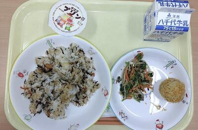 牛乳 豚そぼろひじきご飯 いがぐり揚げ ごま和え たまごプリン