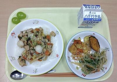 牛乳 ご飯 中華丼(具) 春雨サラダ 野菜チップ ぶどう