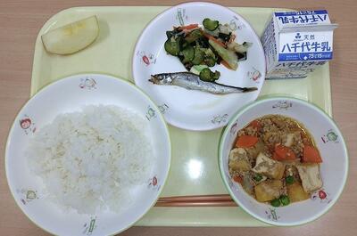 牛乳 ご飯 揚げとじゃが芋のそぼろ煮 焼きししゃも ごま酢和え りんご