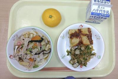 牛乳 煮込みうどん 大根サラダ キャラメルバナナケーキ みかん