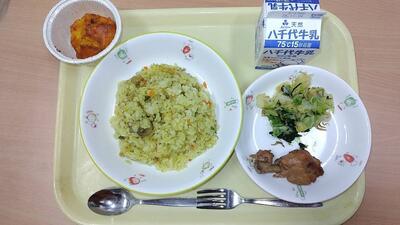 牛乳 メキシカンライス チキンアドボ キャベツのじゃこ和え かぼちゃマフィン