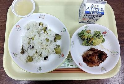 牛乳 わかめご飯 いり鶏 蓮根入り肉団子 ごま和え