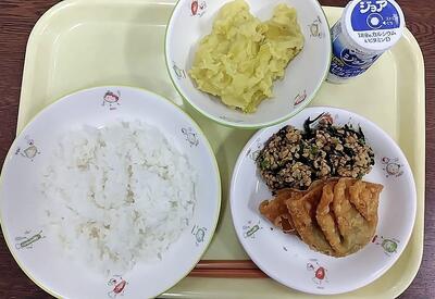 飲むヨーグルト ご飯 揚げ餃子 納豆和え さつま芋のミルク煮
