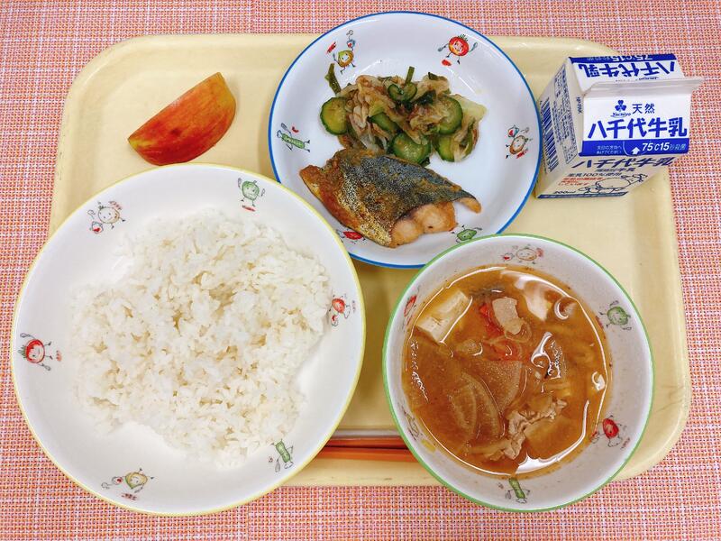 牛乳 ご飯 しいらの葱味噌焼き 和風サラダ 僧兵汁 りんご