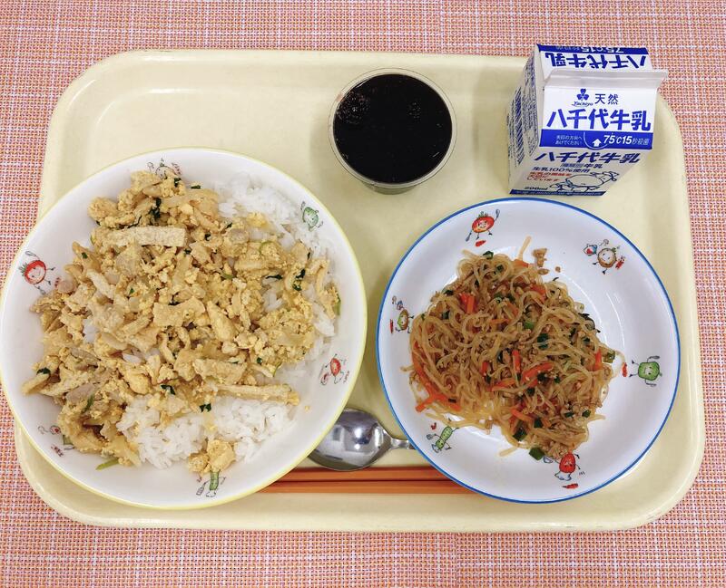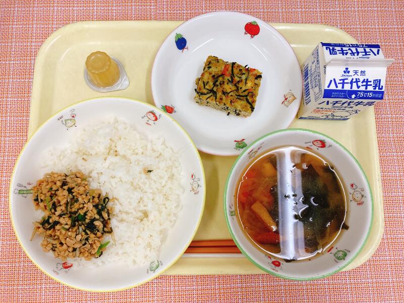 牛乳 ご飯 しらす納豆和え 千草焼 切干大根とわかめの味噌汁 ひとくち桃ゼリー