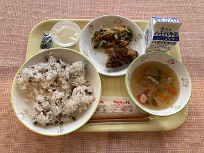 牛乳 小豆ご飯(ごま塩) 鰤カツ ごま酢和え すまし汁 豆乳プリン