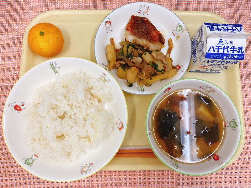 牛乳 ご飯 赤魚の胡麻だれ焼き じゃが芋のきんぴら 大根の味噌汁 みかん
