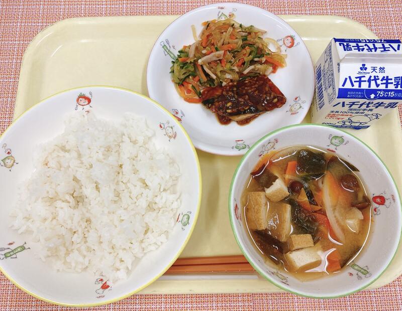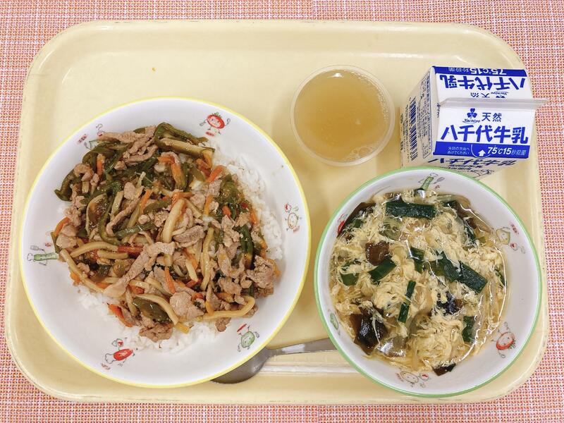 牛乳 ご飯 チンジャオロース丼の具 ニラたまスープ パインゼリー