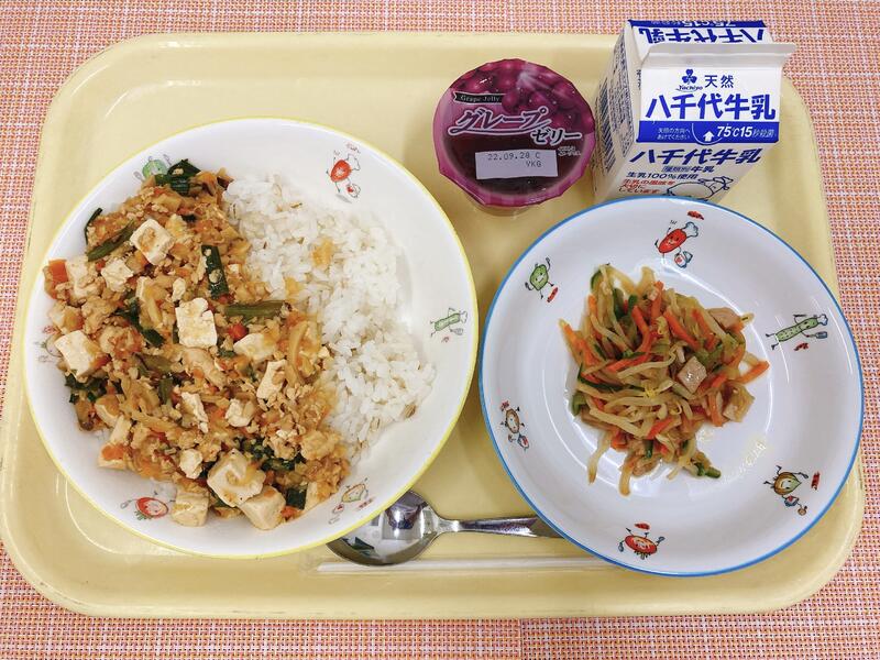 牛乳 ご飯 マーボー豆腐丼の具 中華サラダ ぶどうゼリー