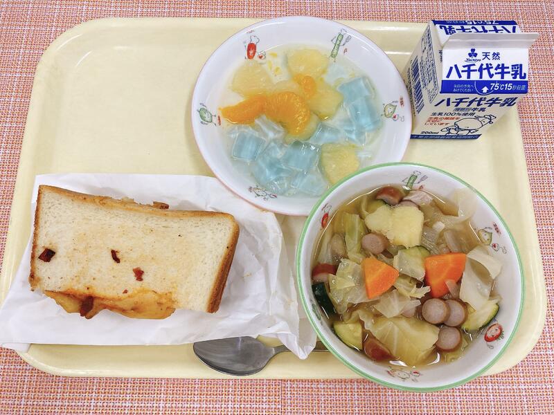牛乳 ピザトースト 夏野菜のポトフ ソーダゼリー入りフルーツポンチ